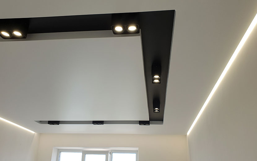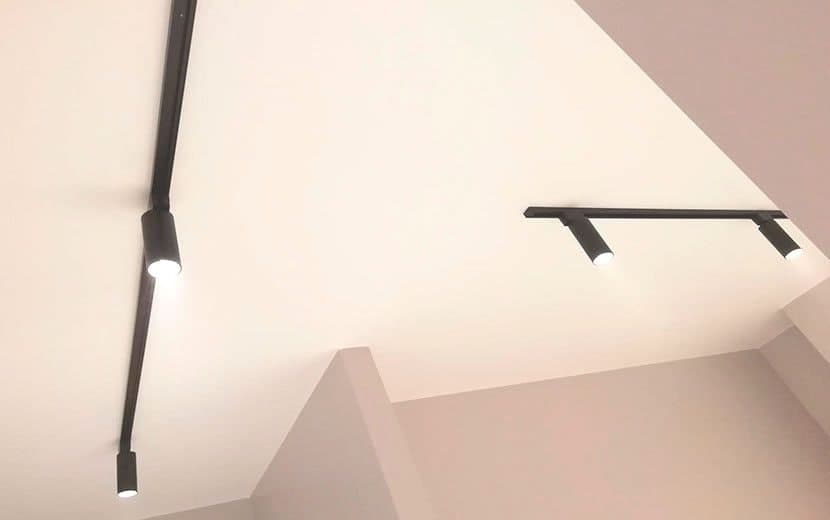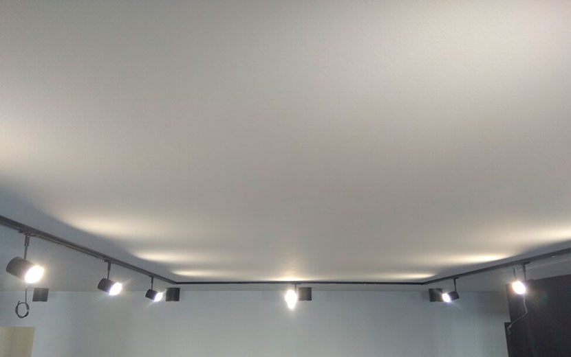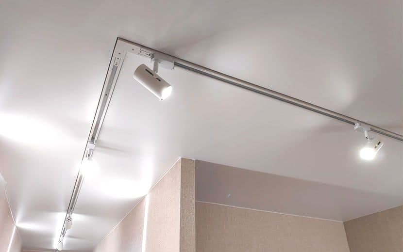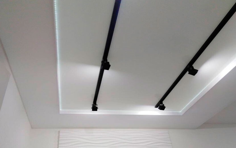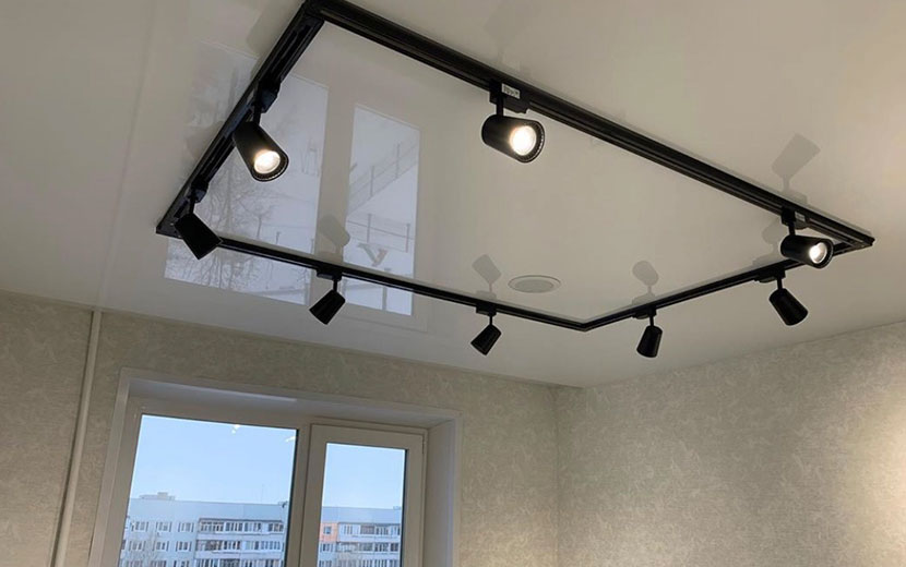 Заказать потолокТрековая система spot создана специально для встраивания в натяжные потолки, а благодаря тому что она использует демпферную систему крепления полотна, она подходит для ПВХ и тканевых натяжных потолков.